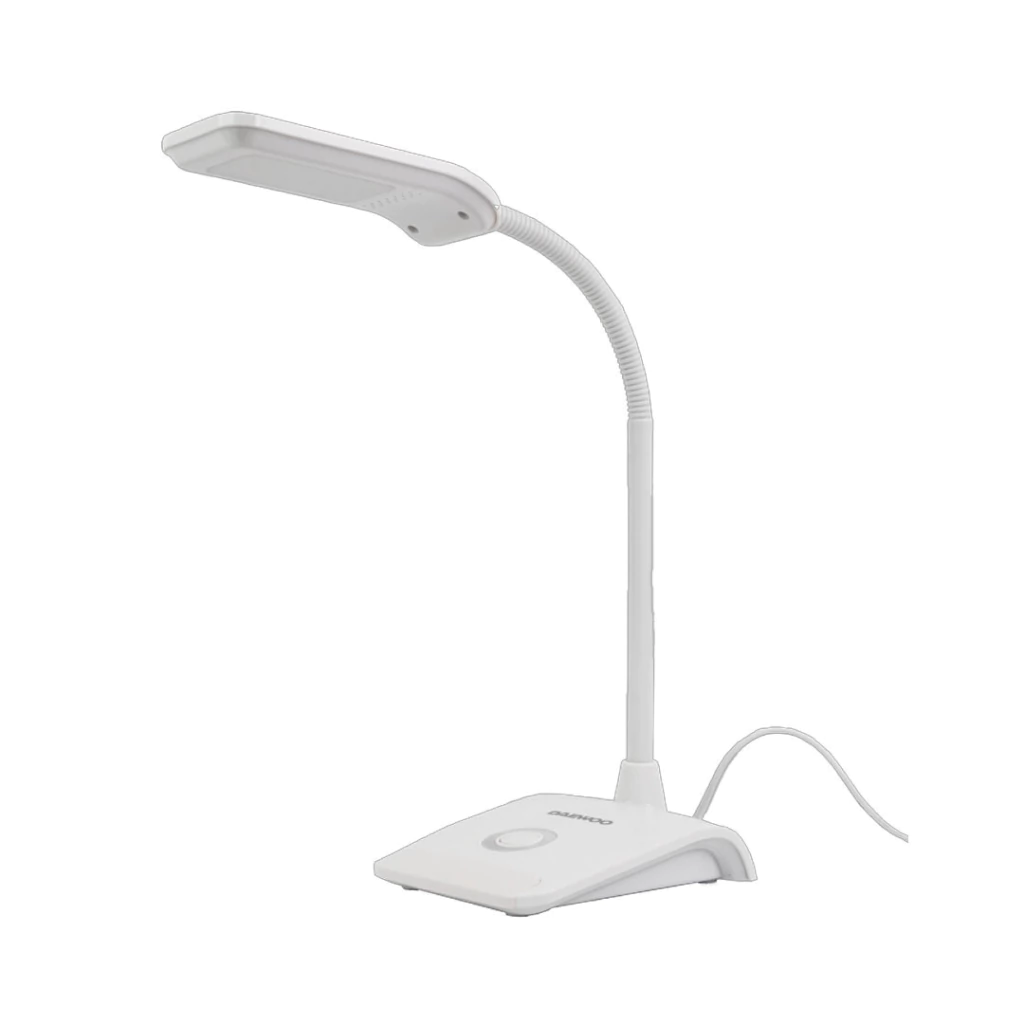 La lampara Daewoo DWL-560DL viene con LED integrado, es decir, no requiere de lamparita extra y tiene una vida útil de 18.000 hs o 5 años según el uso. Cuenta con un largo de cable de 1.80 m y con un botón en su base.